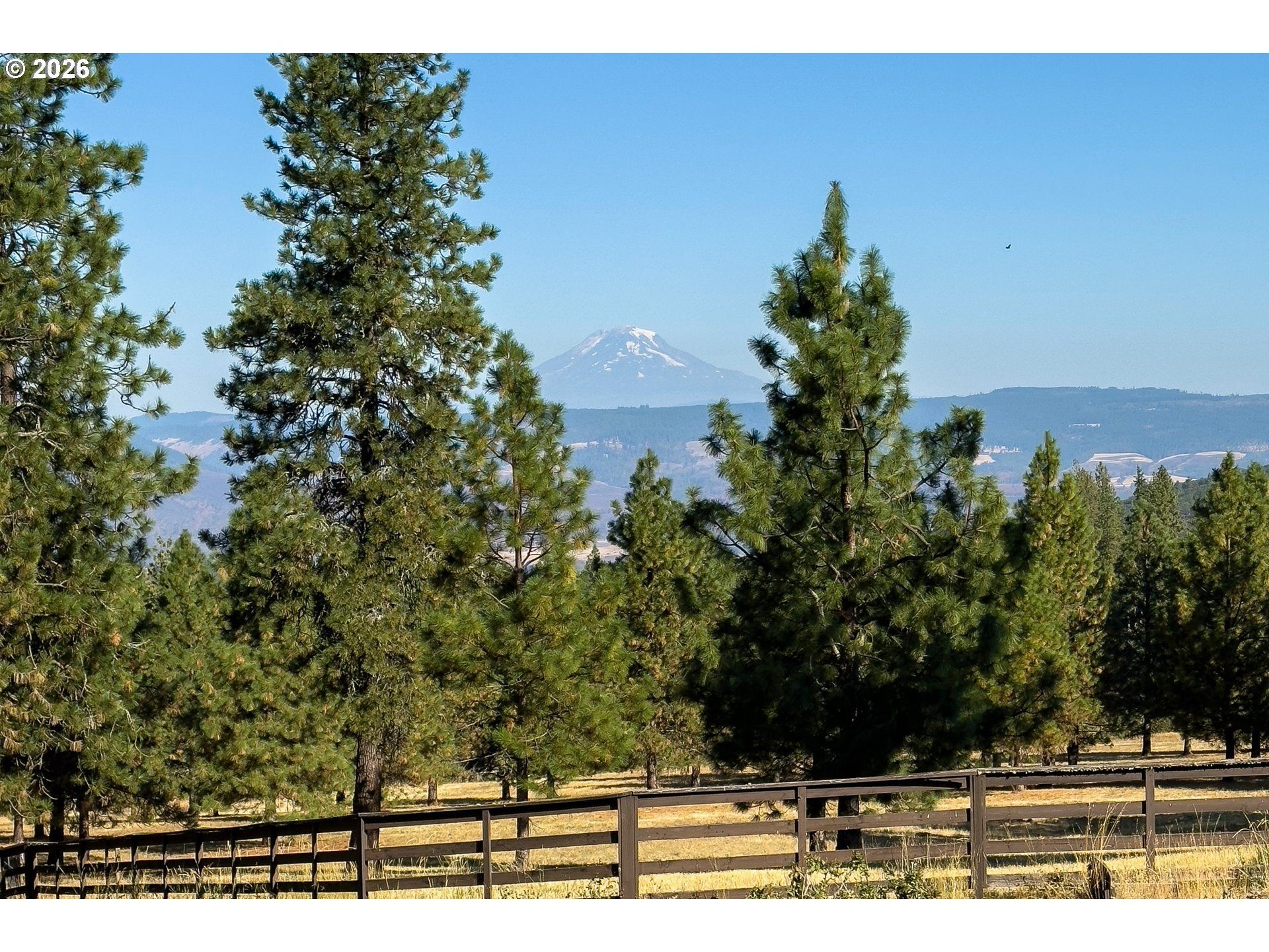 On the coveted Mosier side of The Dalles - just a few hundred feet from the Mosier boundary yet firmly within the Mosier School District and voting district - this forty-acre mountain-view retreat offers rare proximity with the benefit of true Mosier community alignment. Only 10 miles from Hood River & an easy 10-minute drive to acclaimed restaurants, wineries, farm stands, & year-round recreation, the setting feels worlds away while remaining deeply connected to the best of the Gorge.Sweeping views of Mount Adams unfold across gently rolling, fenced pasture framed by pine, fir, and oak. The land is thoughtfully suited for livestock, horses, & a variety of farm animals, offering both functionality & pastoral beauty. A hand-dug, year-round spring, seasonal pond, established well, & water rights provide meaningful infrastructure for self-sufficiency, small-scale agriculture, or an elevated country lifestyle rooted in the land.For the equestrian buyer, this property is uniquely compelling. In addition to a two-stall barn, hay storage, wood shed, and fenced pasture, it borders approximately 1,300 acres of private land with established horse trails - creating the rare opportunity for expansive, uninterrupted riding directly from your gate. Endless trail access without hauling is a true luxury in today's market.The hand-hewn log cabin is oriented to capture commanding mountain vistas, with large windows that flood the open living and kitchen areas with natural light. Upstairs, the primary suite opens to a private view deck with walk-in closet and full bath, while a main-level bedroom and bath provide flexibility for guests or multi-generational living. Rich in authenticity and character, the home invites comfortable living as-is, with room for thoughtful updates over time. Adding to its significance is the rare opportunity to restore or reimagine an additional homesite dating back to 1860, once used by the United States Cavalry - a meaningful piece of northwest history.